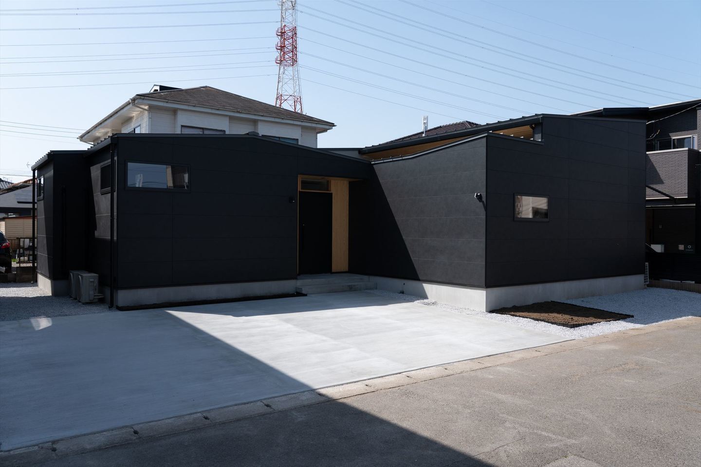 外観は、緩やかな勾配屋根がつくる落ち着いたフォルムに、ダークグレーを基調としたシックなデザイン。周囲の環境にも自然に溶け込む、品のある佇まいが印象的です。