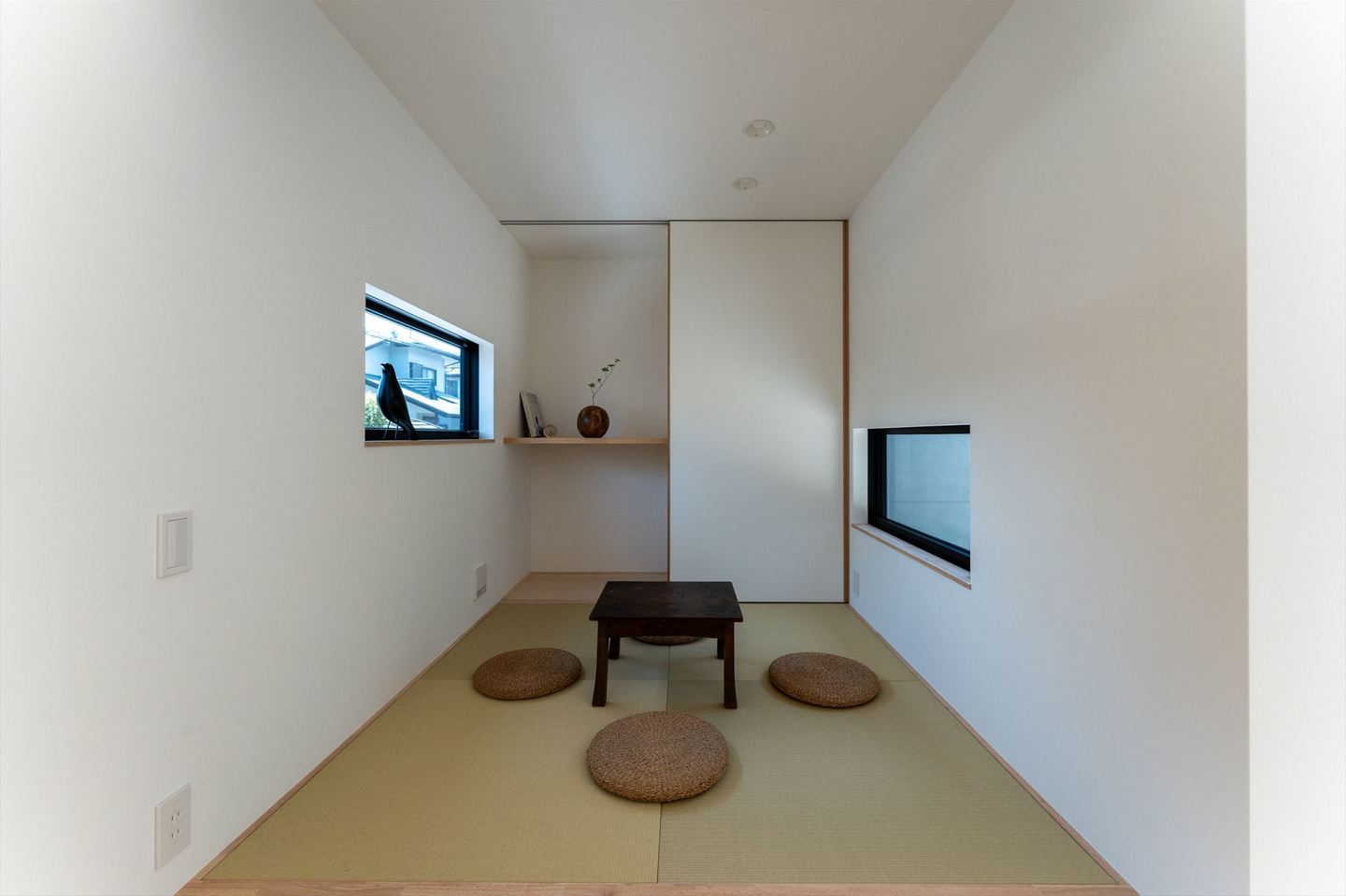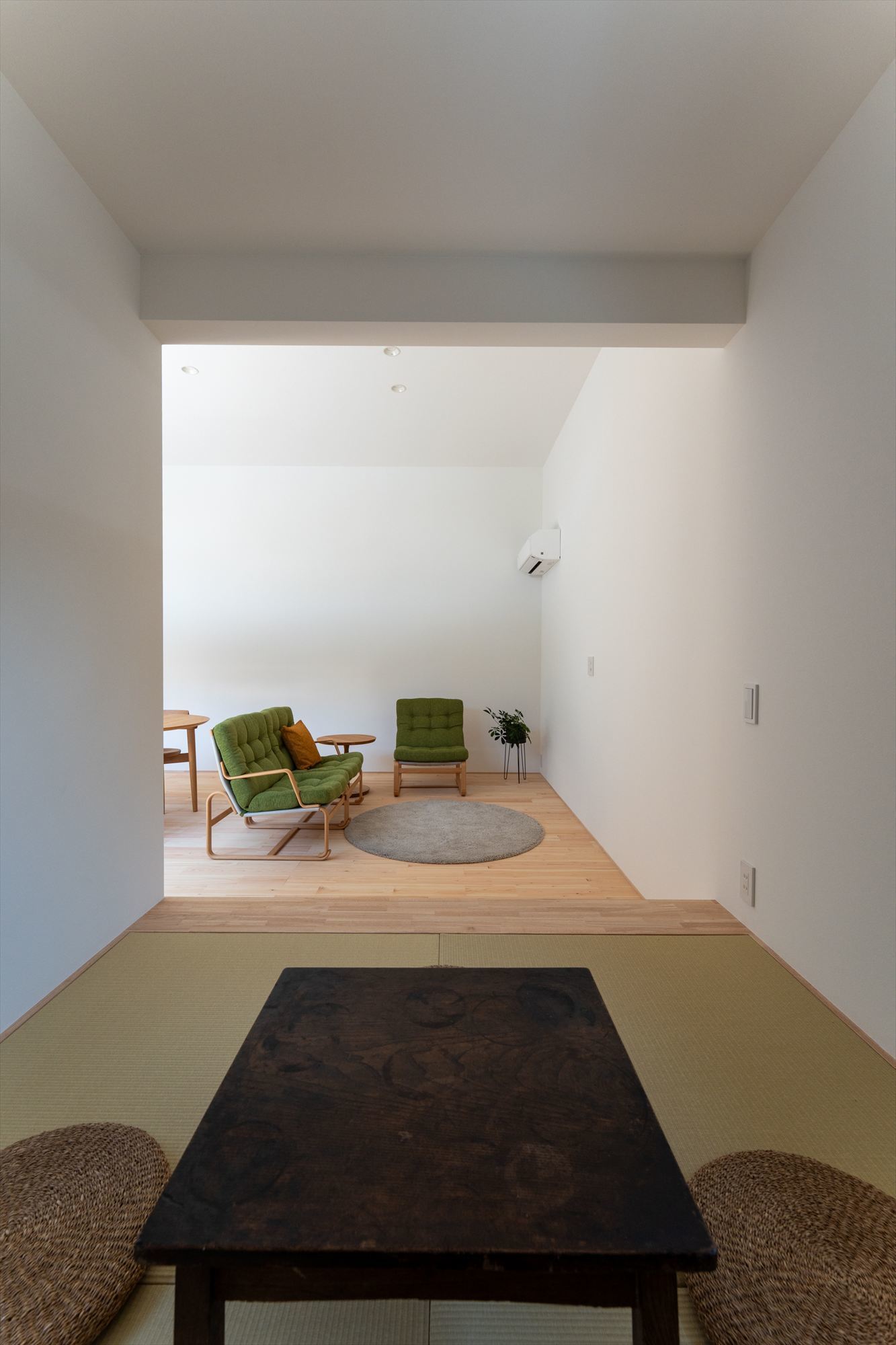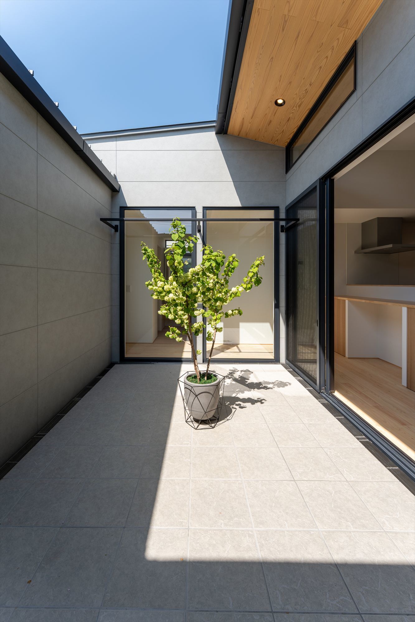 住まいの中心には、外からの視線を遮りながら、明るさと開放感をもたらす中庭を配置。リビング・和室・玄関・廊下に囲まれた中庭は、どの空間からも窓越しにつながり、光と視線に広がりを生み出します。