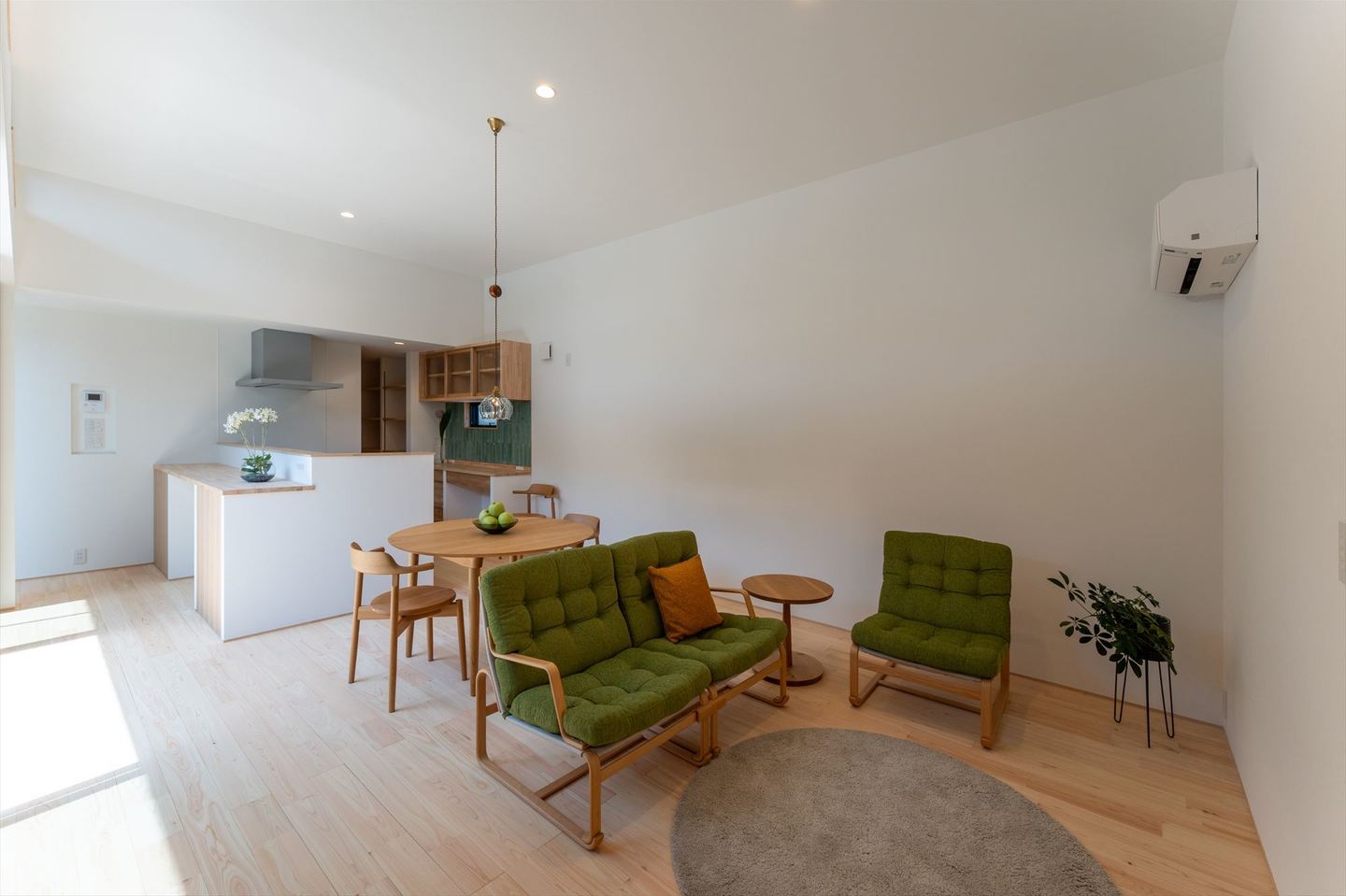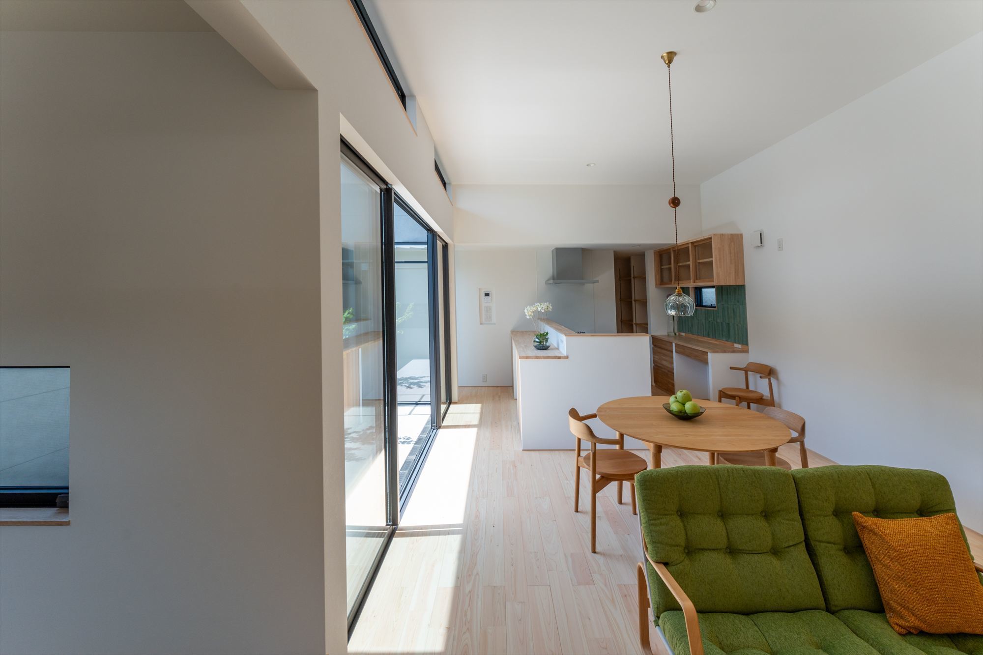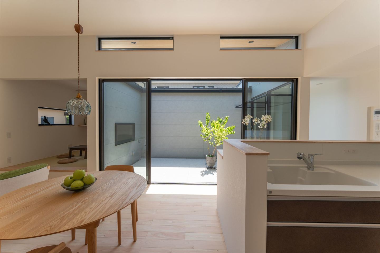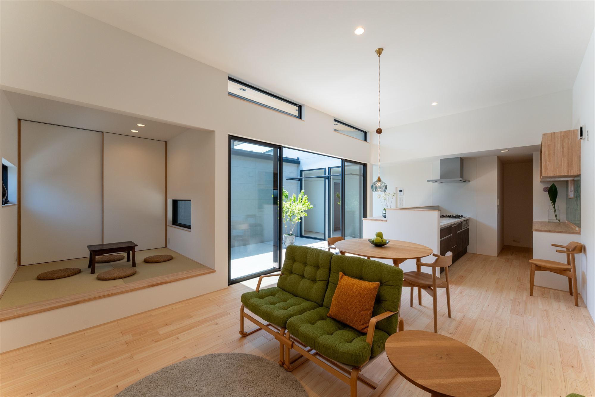 平屋ならではの魅力を活かし、リビングは天井高3mの開放的な空間に。大きな窓を通して中庭と一体となり、内と外が緩やかにつながる心地よさを演出しています。