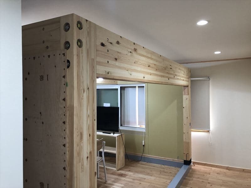 ここは、私たちの標準仕様である「SE構法」の構造躯体とナチュラルな素材で構成された打ち合わせルームです。