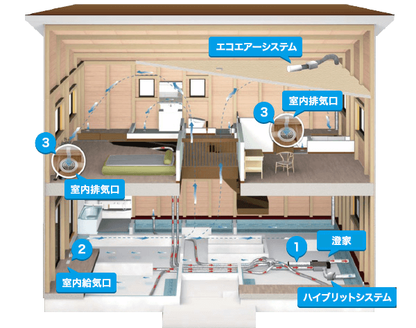 「澄家(sumika)」とは、熱交換型第1種換気システムの一つで、換気装置を床下に置き、吸気はダクトレスで床下を通して家中にきれいな空気を取り入れ、各部屋からの排気はダクトを通して家の外に排気していくというシステムです。