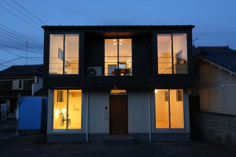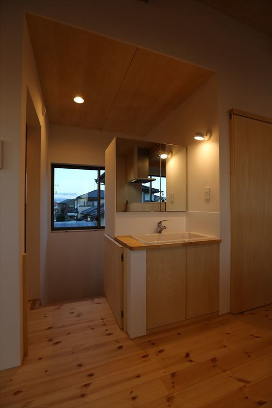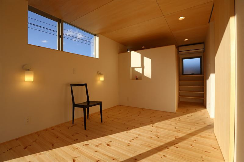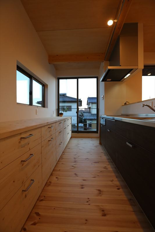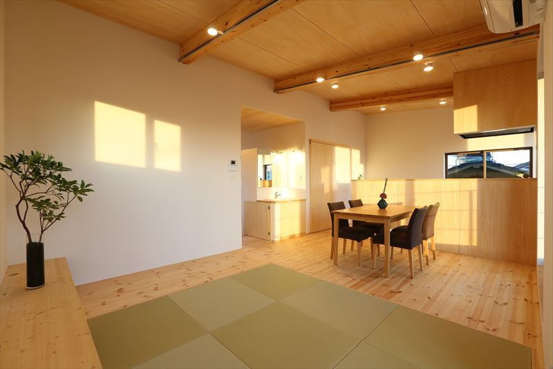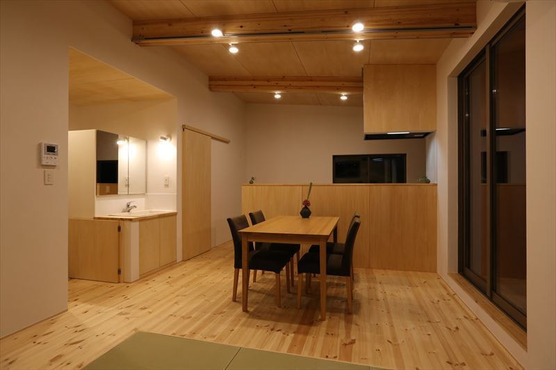 建物の前面に大きな開口を多く設置し、道路側に小さな開口と外からの視線を遮りプライベートを意識したつくりになっています。また、上り天井にしたことにより、縦にも広い空間で、無垢材の心地よいあたたかな住まいです。