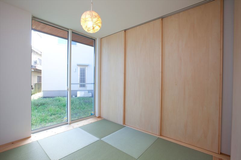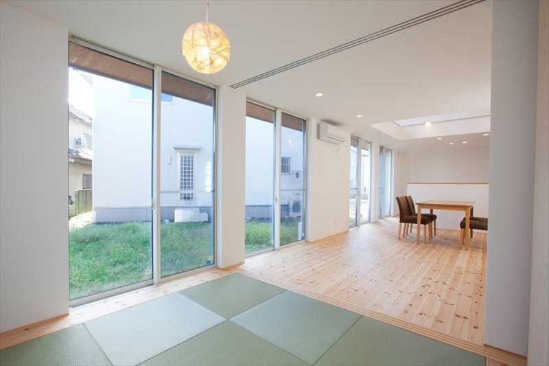 真四角の琉球畳を引いた和室とオープンにつながるリビングには、大きい窓を設置して開放的で明るい空間となっています。
