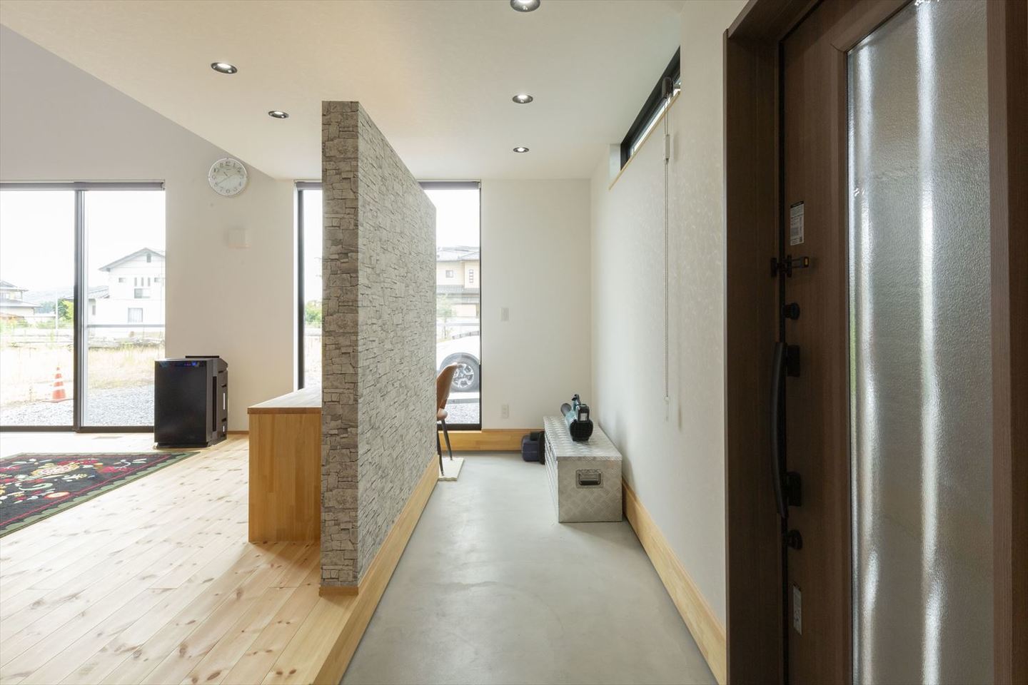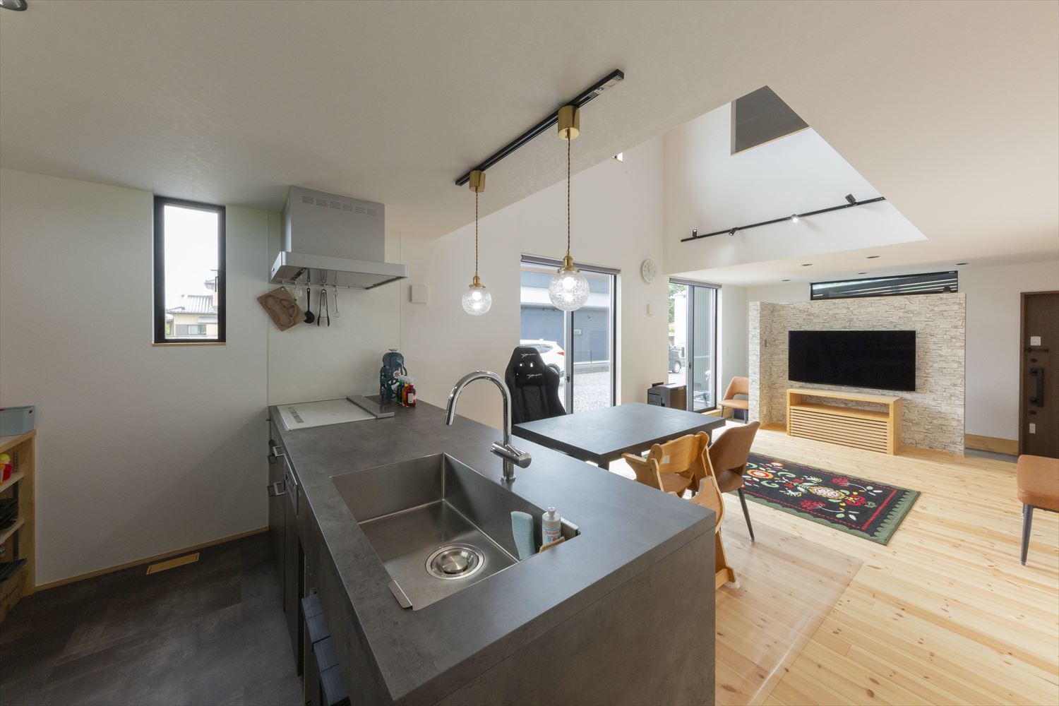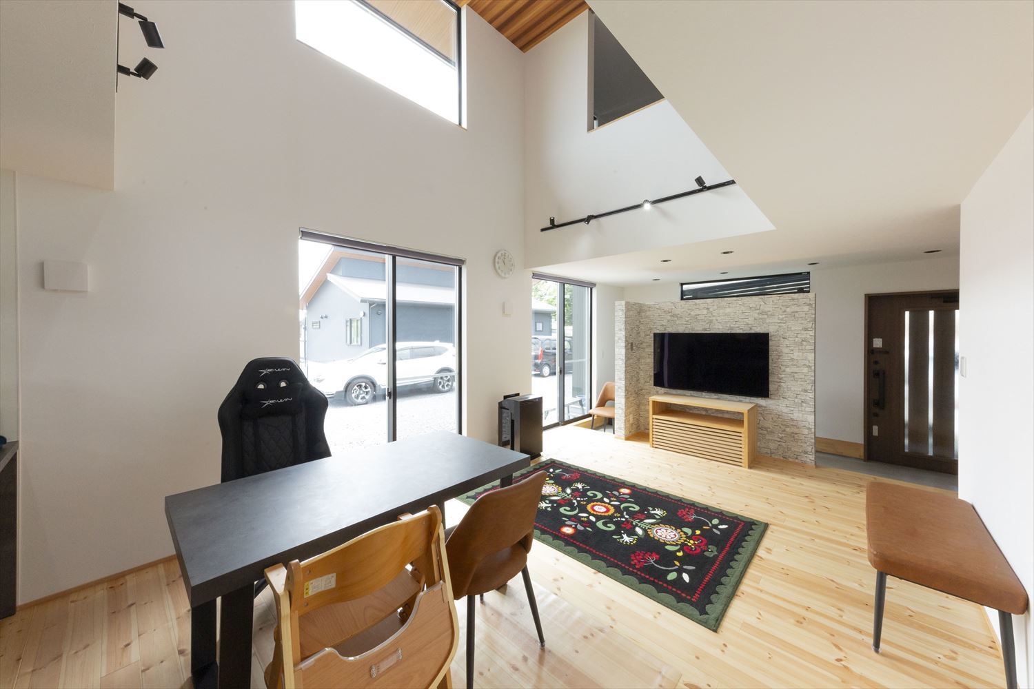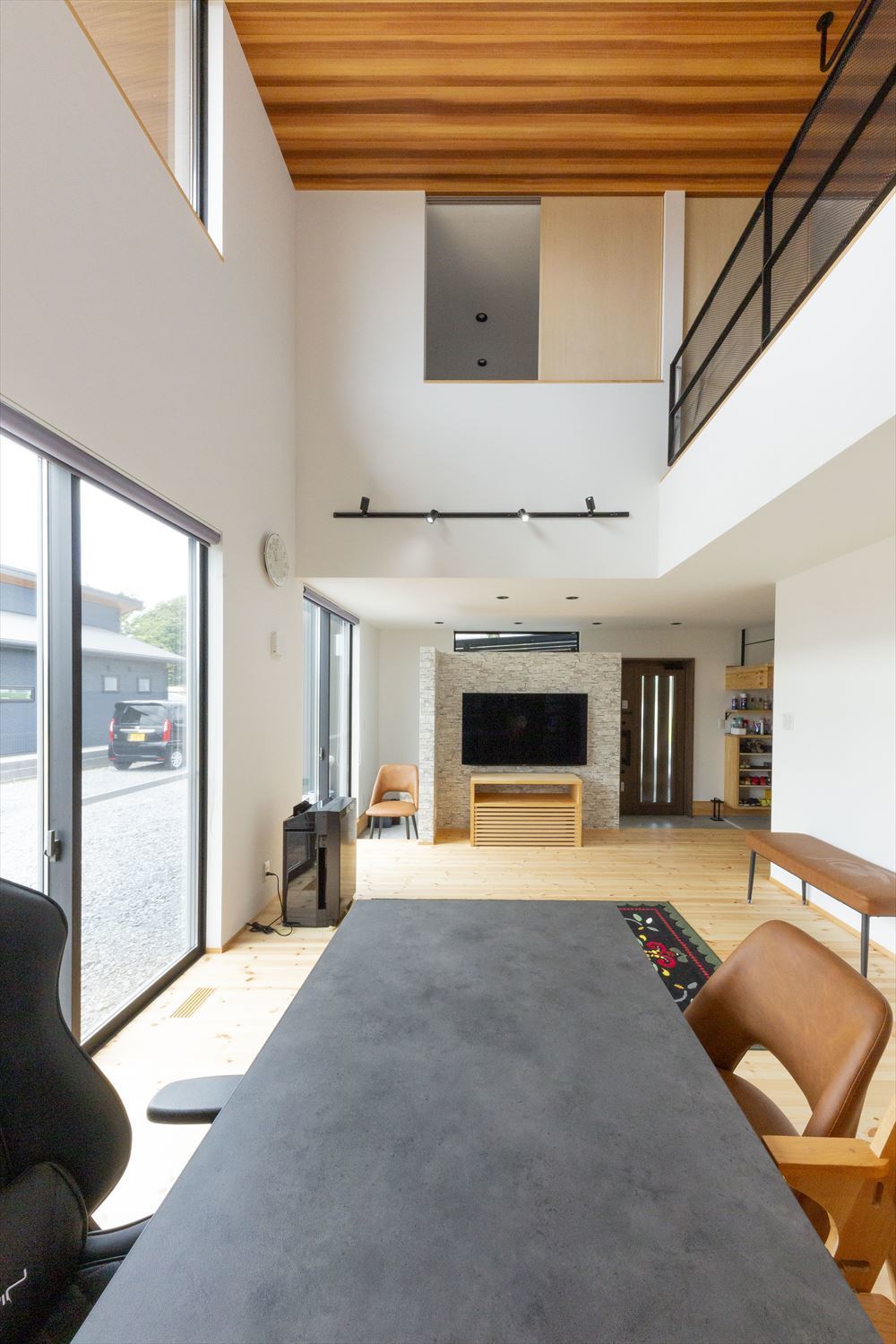 玄関に入ると、広めの土間スペースから吹き抜けの気持ち良い開放的なリビングぐダイニングキッチンに、一室空間でつながります。