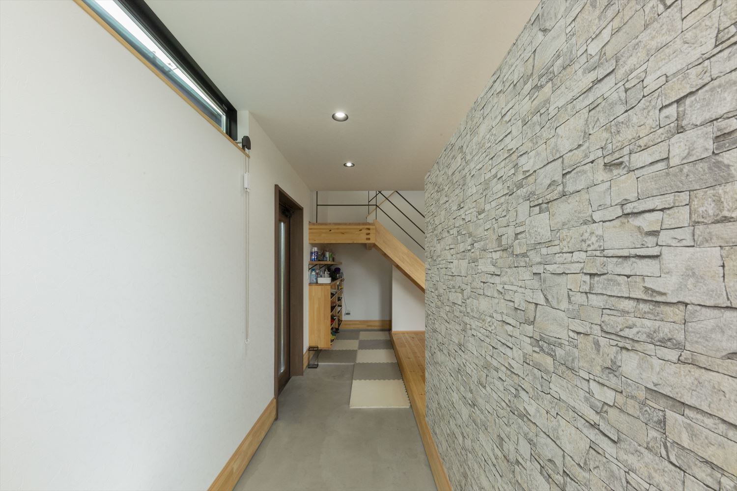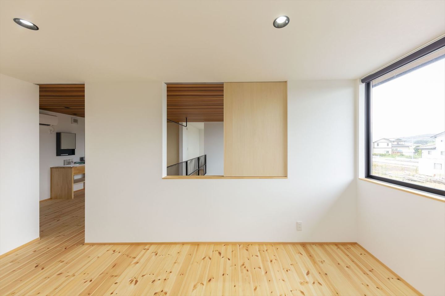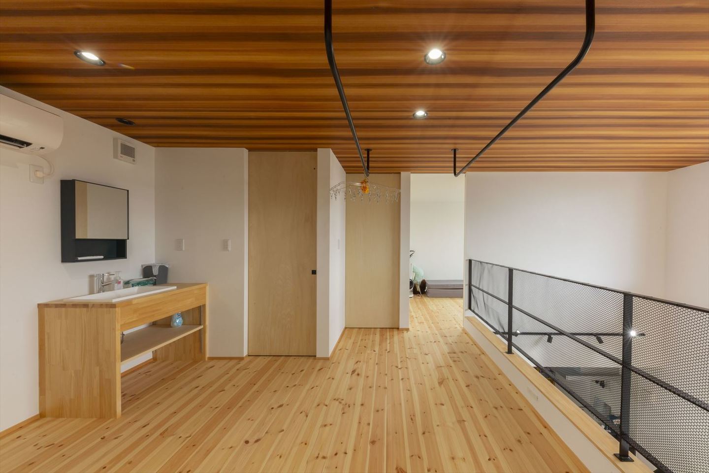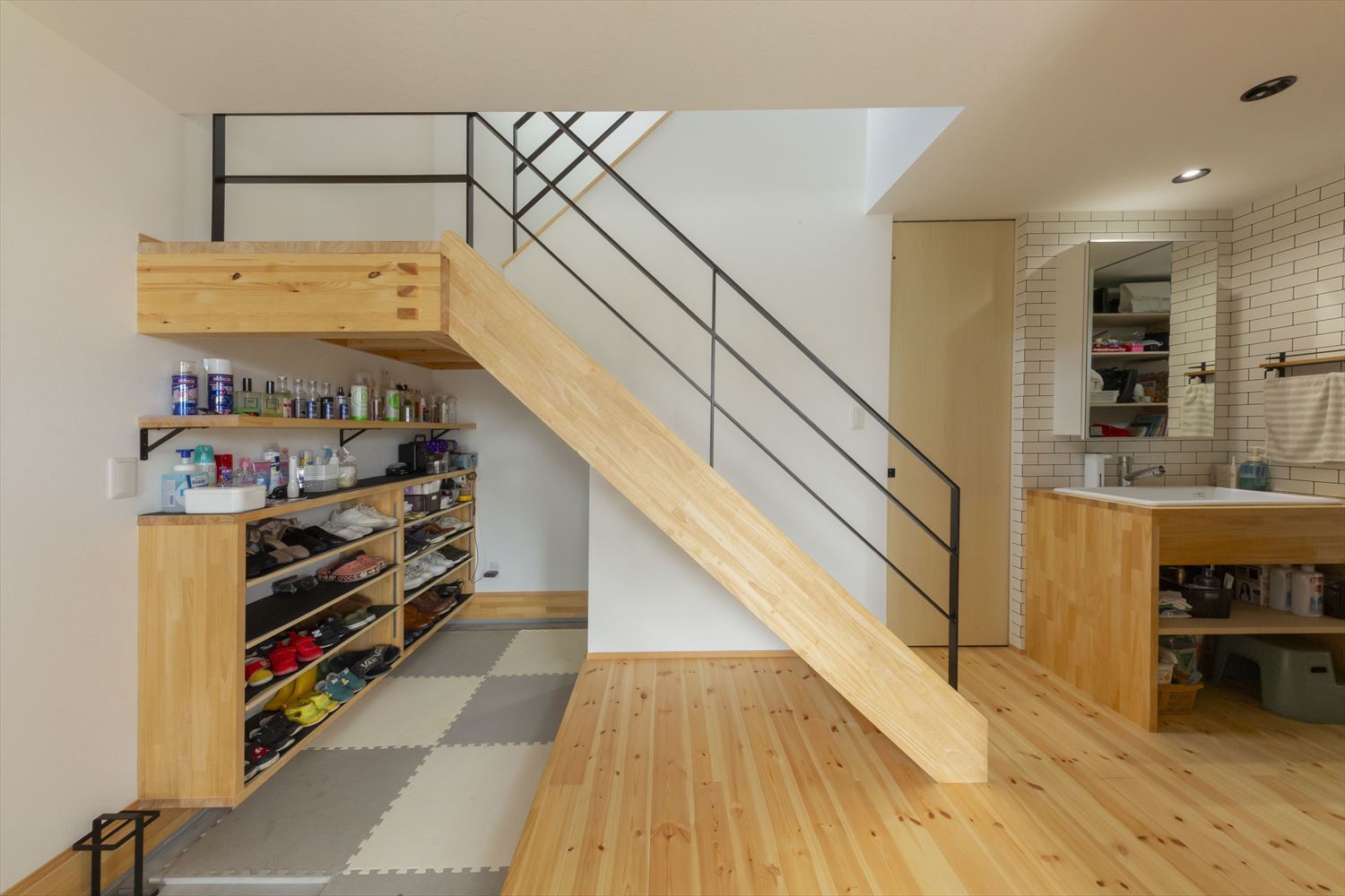 オープンな階段で2Fに移動すると、リビングの吹き抜けを通して家全体が大きな一つの空間でつながっていることを実感できます。家のどこにいても家族の息遣いを感じるお施主様のライフスタイルを実現しています。