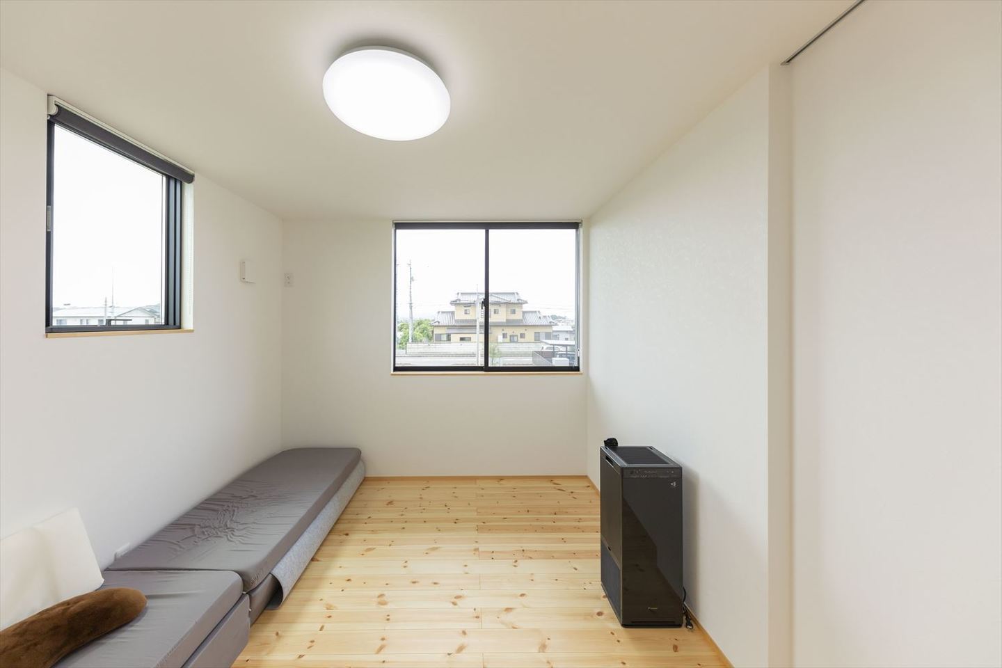 天井とサッシのラインがすっきりと繋がり、シンプルながらも洗練されたデザインの空間です。