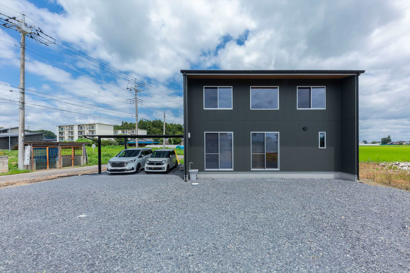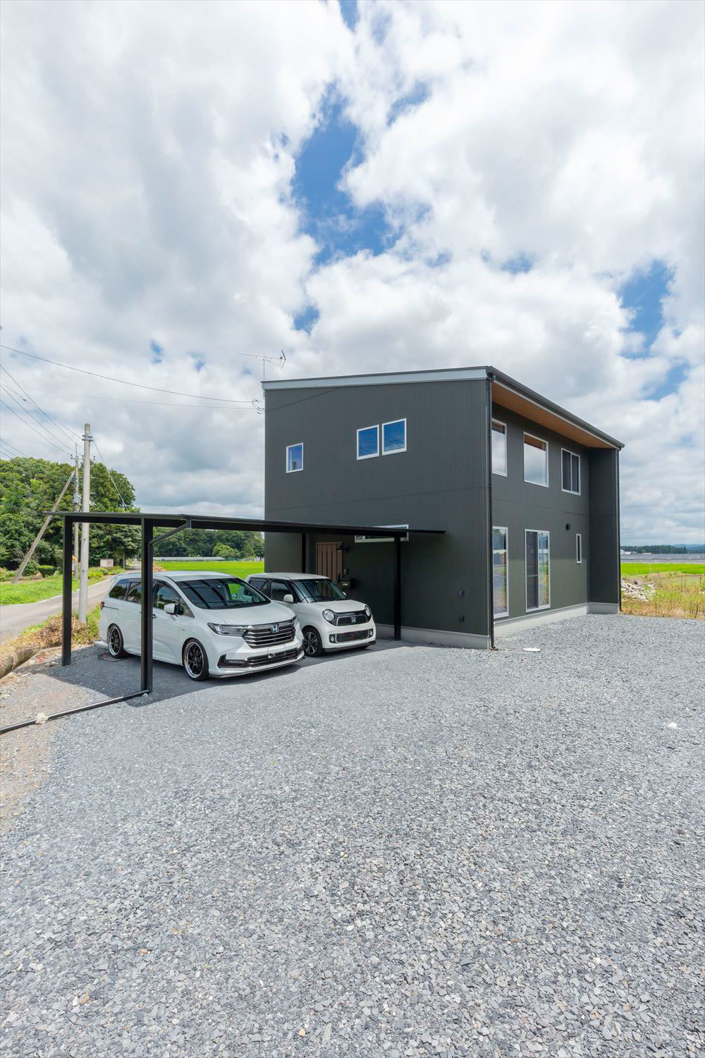 正面からのスクエアでシンプルなフォルムが特徴のお家です。