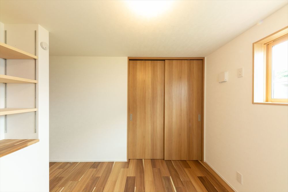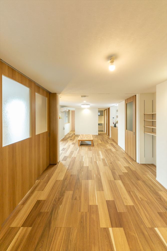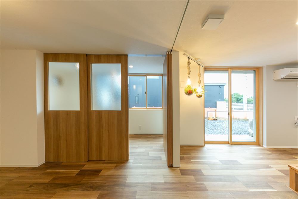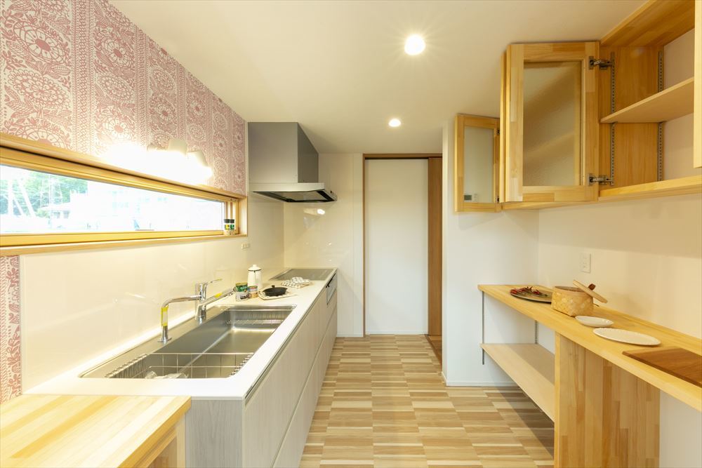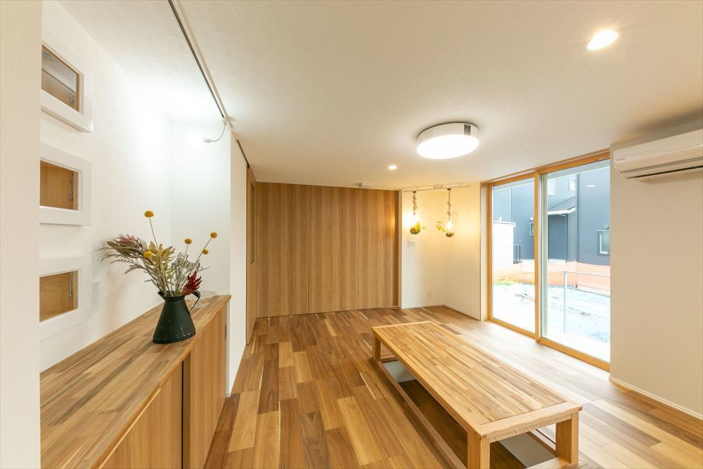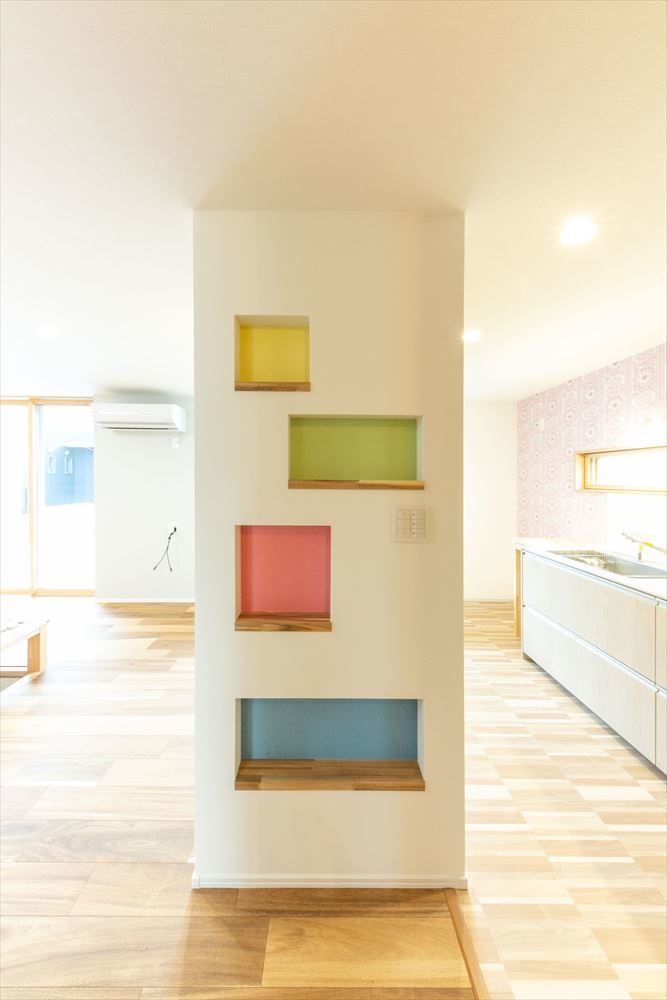 LDKは優しい無垢床材と造作建具や造作収納で、全体的にすっきりとしたナチュラルなテイストに仕上がっています。キッチン横の壁のカラーのニッチもアクセントとしてかわいらしい