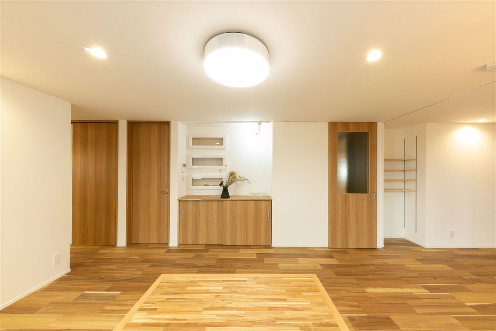 リビングの中央にはテーブルがあり、掘りごたつとして使えるような床下の施工となっています。