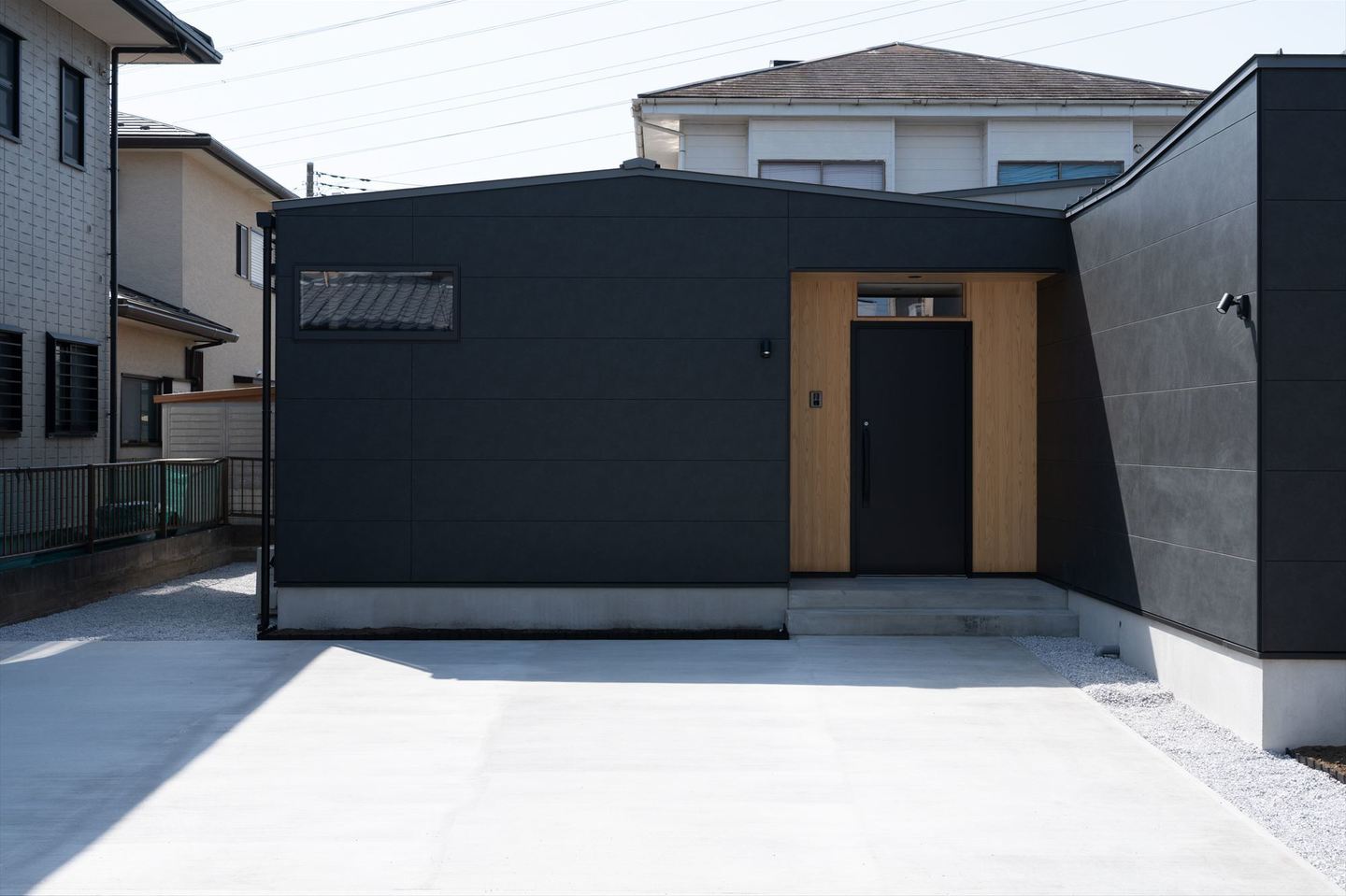 外観は、緩やかな勾配屋根がつくる落ち着いたフォルムに、ダークグレーを基調としたシックなデザイン。周囲の環境にも自然に溶け込む、品のある佇まいが印象的です。
