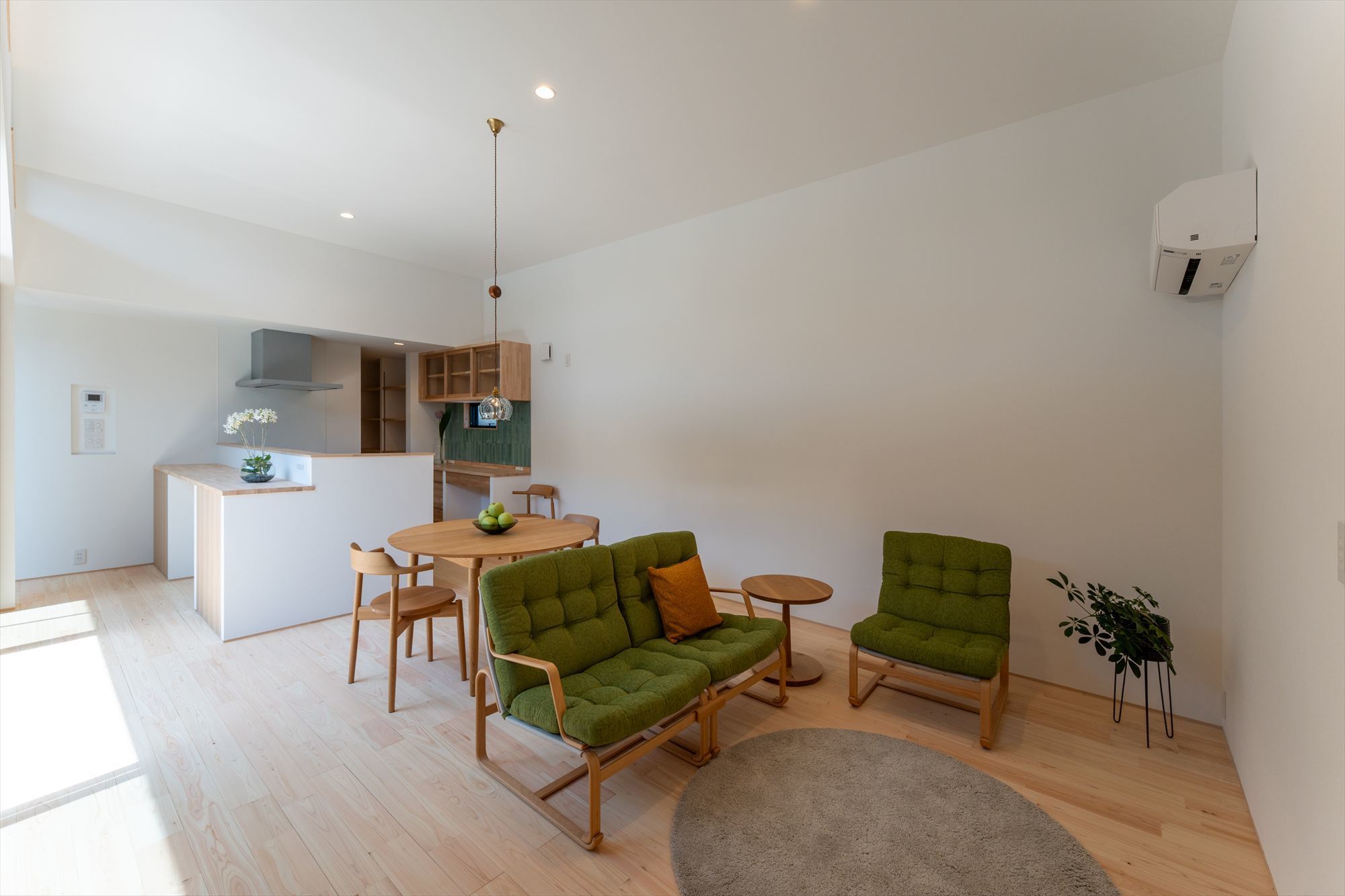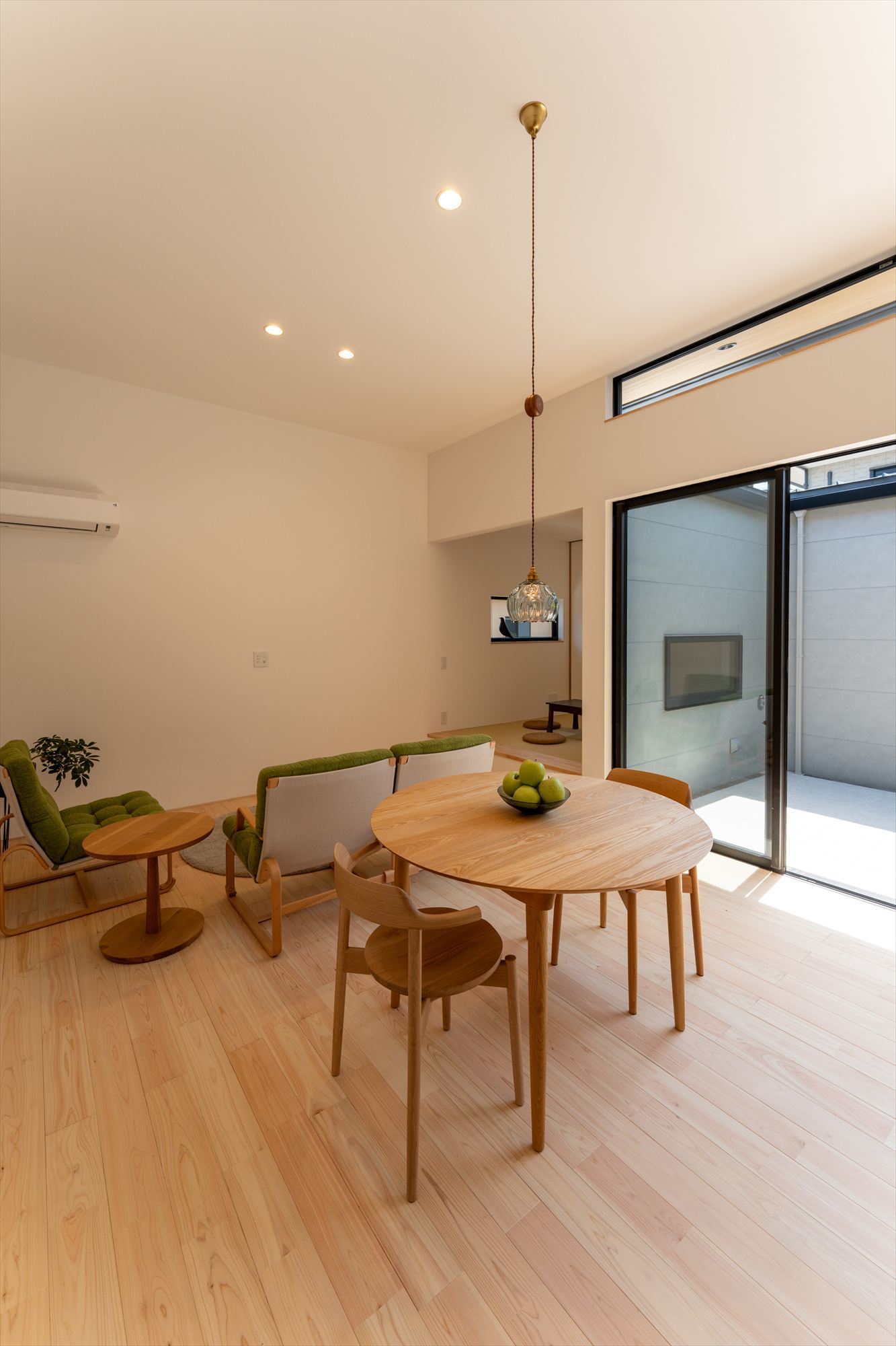 平屋ならではの魅力を活かし、リビングは天井高3mの開放的な空間に。大きな窓を通して中庭と一体となり、内と外が緩やかにつながる心地よさを演出しています。