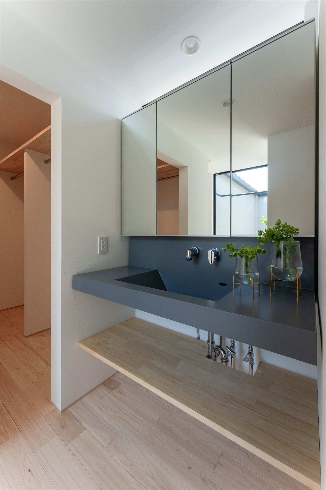住まいの中心には、外からの視線を遮りながら、明るさと開放感をもたらす中庭を配置。リビング・和室・玄関・廊下に囲まれた中庭は、どの空間からも窓越しにつながり、光と視線に広がりを生み出します。